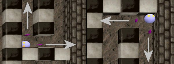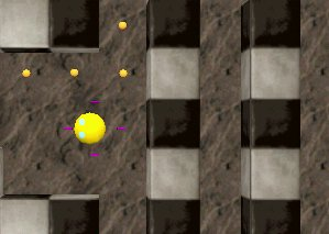 If you look at the first example, the enemy is coming from right to the left; the available ("free") directions are up and right. The enemy came from the right so it wouldn't look that clever if it would bounce off the wall and return where it came from so this possibility has been disabled in enemy's code. In this case, the enemy will go up. In the second example, the enemy is coming going up and it won't return down, but move to the left because I set this limit in its code for this situation. The enemy can pass through dots so I am using this line in its action (the dots are passable): move_mode = ignore_passents; Here's the action attached to every dot: action dot The dots are aligned to player's z; this way I don't need to make sure that I place them at the proper height in Wed. If the player comes closer than 30 quants, the dot will be eaten and the score will be increased by 10. The function that kills the player is simple; player's scale is lowered 10 times and then the player is removed. function kill_me() If you want to move to the next level, check the score in a loop; score = 600 can take you to the next level if you have 60 dots in the level. What about "real" AI? This enemy of yours does nothing but moves correctly in the level! This part is easy and is left as an exercise for you. Pacmen has four different enemies - I've coded the dumb one. Don't worry - I'll explain how to code the most Pac-thirsty enemy right here: