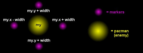 Pacmen I remember myself playing Pacman on a Sinclair Spectrum computer. These were the days! If you were a programmer, you had to make sure that your game has less than 48kb - or it wouldn't fit in the memory! Pacmen uses a "little" more memory - it is a Pacmen (several men :) not Pacman. Function main has nothing special in it; let's take a look at the action that drives our hero: action pacman Pacman is sensitive to other entities; if it collides / is run over by enemies, its kill_me event is triggered. The camera can pass through walls, looks down, moves with the player and is placed 1000 quants above the player. Pacman and its enemy are using invisible "antennas" (markers) to detect their environment and act like smart creatures. I have used this technique in my first AI demo in AUM. In this picture you can see the pink antennas (run the game with pacmen -d markers if you want to see them too): We are using four markers for pacman and four markers for the enemy, like below: