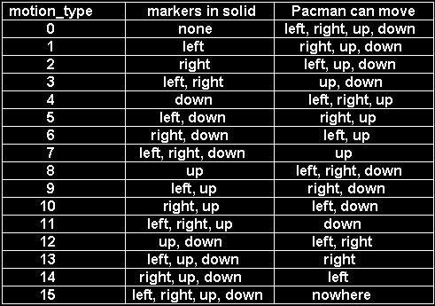 while (player != null) As long as the player is alive (player != null) we reset motion_type (more on that later). We are using rotated coords for all the markers because the player and enemy are rotated models, too. player_left.x = my.x; We check the content of the player_left marker and if it is in solid, we add 1 to motion_type. If player_right == content_solid -> motion_type += 2, player_down == content_solid -> motion_type += 4, It is clear that motion_type = 15 can never happen, but I wanted to show you all the possibilities. So we have four markers, we check their content and depending on the result, we allow them (pacman and enemy) to move only if they choose a direction where the road is "clear". if (motion_type == 0) if (motion_type == 1) if (motion_type == 2) if (motion_type == 3) if (motion_type == 4) if (motion_type == 5) if (motion_type == 6) if (motion_type == 7) if (motion_type == 8) if (motion_type == 9) if (motion_type == 10) if (motion_type == 11) if (motion_type == 12) if (motion_type == 13) if (motion_type == 14) Now if the following line won't give you a headache then nothing else will: if ((my.pan == 0 && motion_type < 8) || ((my.pan == 90) && (motion_type % 2 != 1)) || The action attached to the enemy is similar; the only big difference is that we generate a random number and depending on its value we set the direction for the enemy.