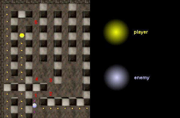 The enemy must make sure that its x and y coordinates are equal with player's x, y coords (this means that the enemy has "got" the player). When the enemy reaches the 1st red point, it can't come closer to the player - it must move to the right, towards the 2nd point. When it arrives there its motion type has changed; the enemy knows that by moving upwards the distance between it and the player is getting smaller (on y) so it will move towards the 3rd point (we aren't using any random value here). By choosing to move towards the 4th point (again, not a "random" decision) the enemy knows that the distance between it and the player (on x) will get smaller. The 5th point can be a random decision or not, depending on player's position. And you thought that creating a Pacman clone is easy! Shooting switches / statues This piece of code will show you how you can move to the next level only if you have destroyed a certain number of idols / statues / switches / whatever you want. action statue Every statue is sensitive at shooting; their number is counted at startup. If the player comes close to a statue (or shoots it) a sound is played, the number of statues is decreased, the statue breaks in pieces and disappears. What about shooting? Here's the event that is triggered when the statue is shot: function destroy_me() It doesn't look like having something to do with the statues, isn't it? If you look at action statue above you'll see that the statue is destroyed if the player comes close to it OR if skill10 = 1 - that's what the event does. We must have another entity that takes us to the next level on impact: action next_level When we impact with this entity, its change_level event will be triggered: function change_level() You can see that we can't move to the next level if we haven't destroyed all the statues. You will have to remove the comment for the load_level line and change the name to your_next_level.wmb |